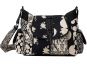 Inspirata din gradinile japoneze, aceasta geanta cu buzunare laterale si imprimeu floral bicolor are clapeta frontala cu nasturi si intariri din piele neagra.